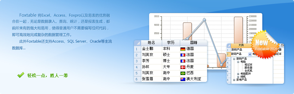 Foxtable將Excel、Access和Foxpro的優(yōu)勢融合在一起,并獨(dú)有層級數(shù)據(jù)管理功能,普通用戶不需要編寫任何代碼,即可完成各種復(fù)雜的數(shù)據(jù)管理工作,真正做到拿來即用。